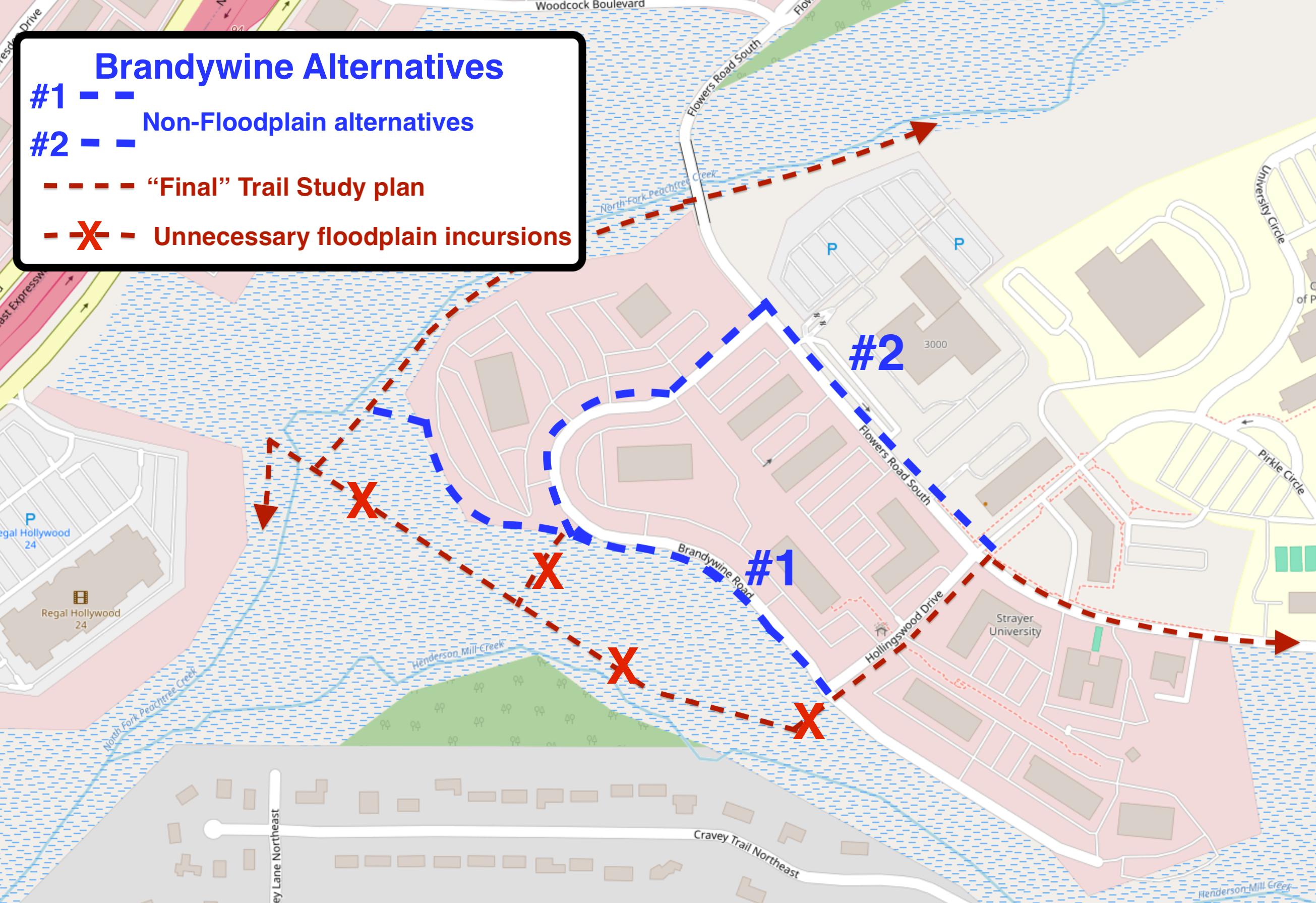 (1/9/2026) Caleb Wittenmyer (Dekalb Greenspace Manager) and Paige Singer (Dekalb Parks Interim Director) have confirmed to us that they have decided to replace the entire HMC floodplain routing with the full Brandywine alternative alignment, as shown in this map. Further, Mr. Wittenmyer also confirmed that both Mercer and Dekalb District1 Commissioner Robert Patrick have accepted this map. Going forward, if the routing is implemented, it will be along Brandywine.
